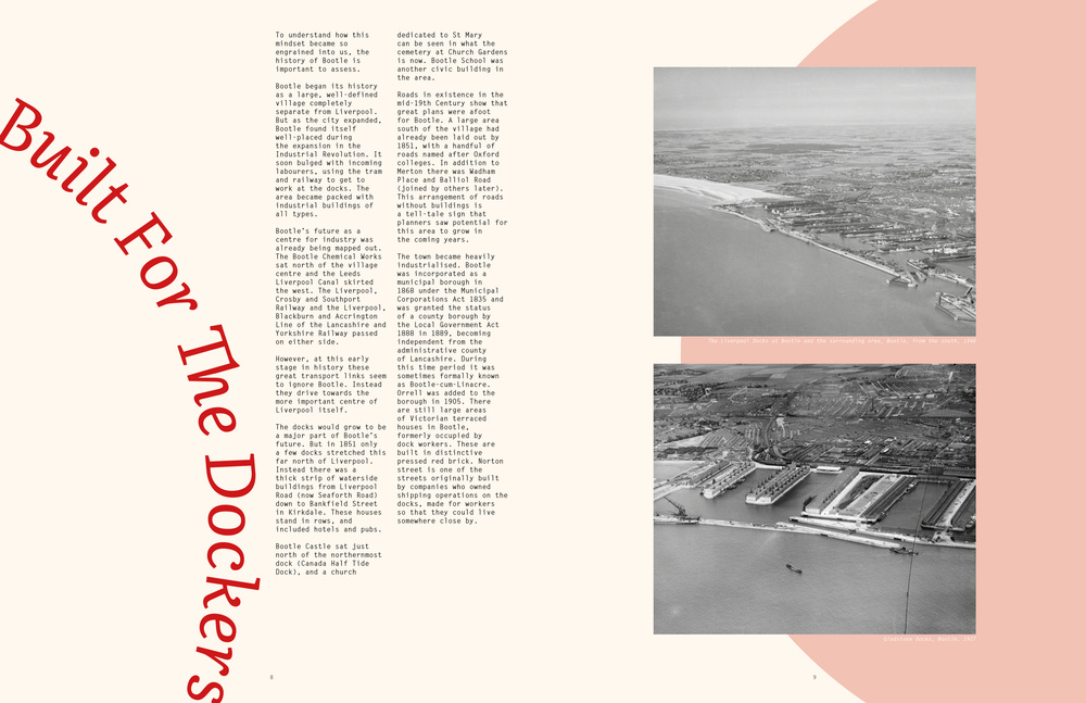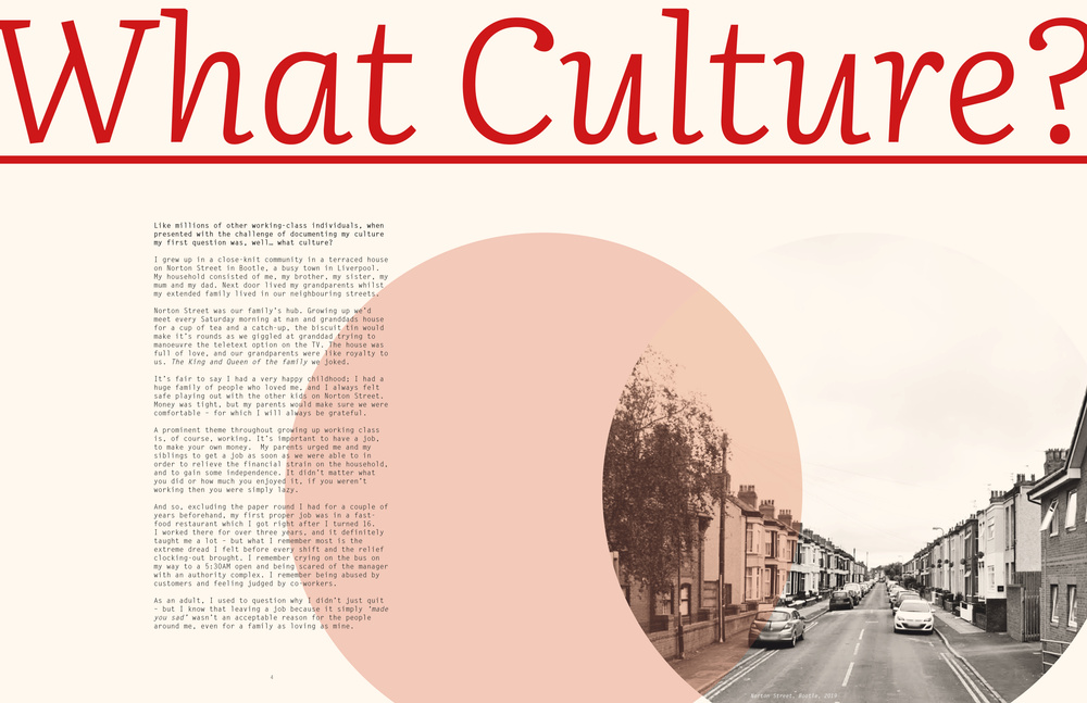 When presented with the opportunity to document "my" culture, I took this as a chance to do some research into my own roots tied in with the small bustling Liverpool town - Bootle. This zine is a celebration of culture, I tied the pages together through a red and cream colour theme and black & white imagery. I use bold and large text to title articles, and had some fun with the balance of text in relation to the images. The zine is 8.5 x 11 inches (letter).